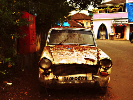 Left to right: Rusted Volkswagen cars marked the entrance to Fontainhas. The enchanting lanes of Fontainhas. Clicked in October 2015.